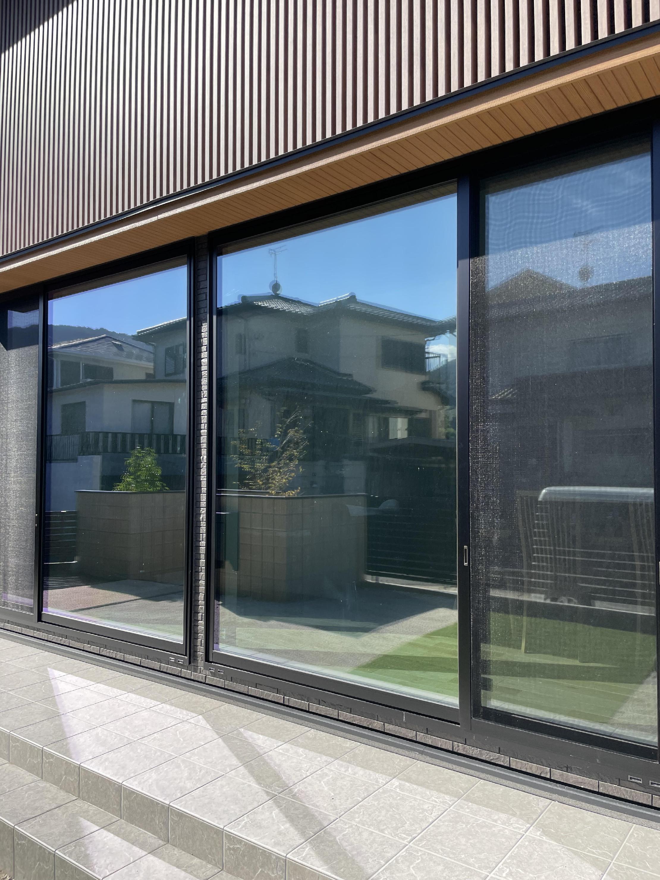 今回はバーチカルブラインドをフルオープンにすると、隣家と道路から丸見えのリビングの窓に目隠しミラーフィルムの施工でした。
